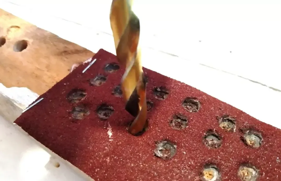 Затем вставьте сверло в шуруповёрт и переключите его на реверс. Просверлите несколько отверстий в наждачной бумаге — около 15−20.