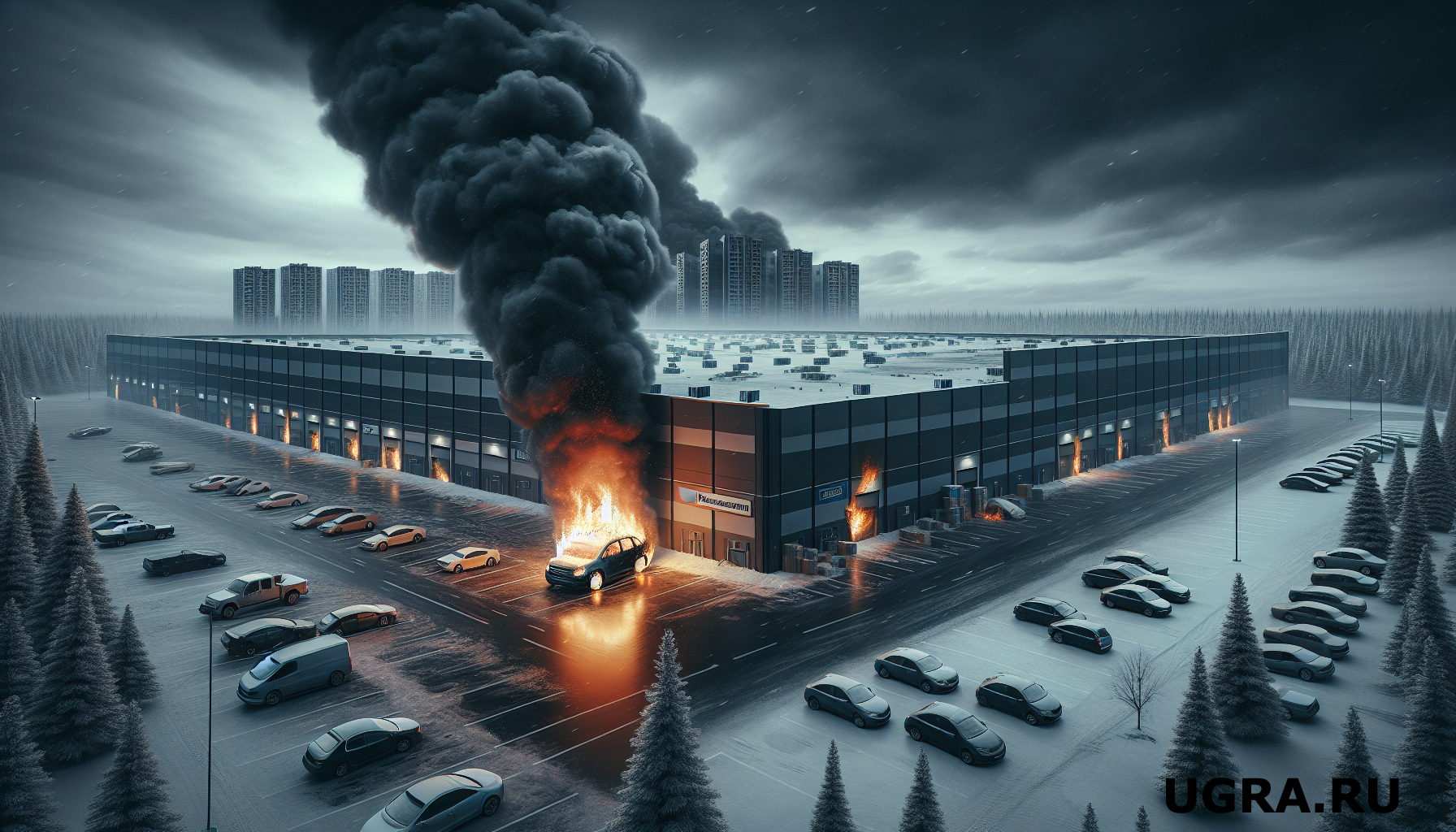 В Сургуте днём 3 февраля произошёл пожар на территории распределительного центра торговой сети «Пятёрочка» на Югорском тракте. Огонь охватил легковой автомобиль Hyundai Solaris, припаркованный у здания.